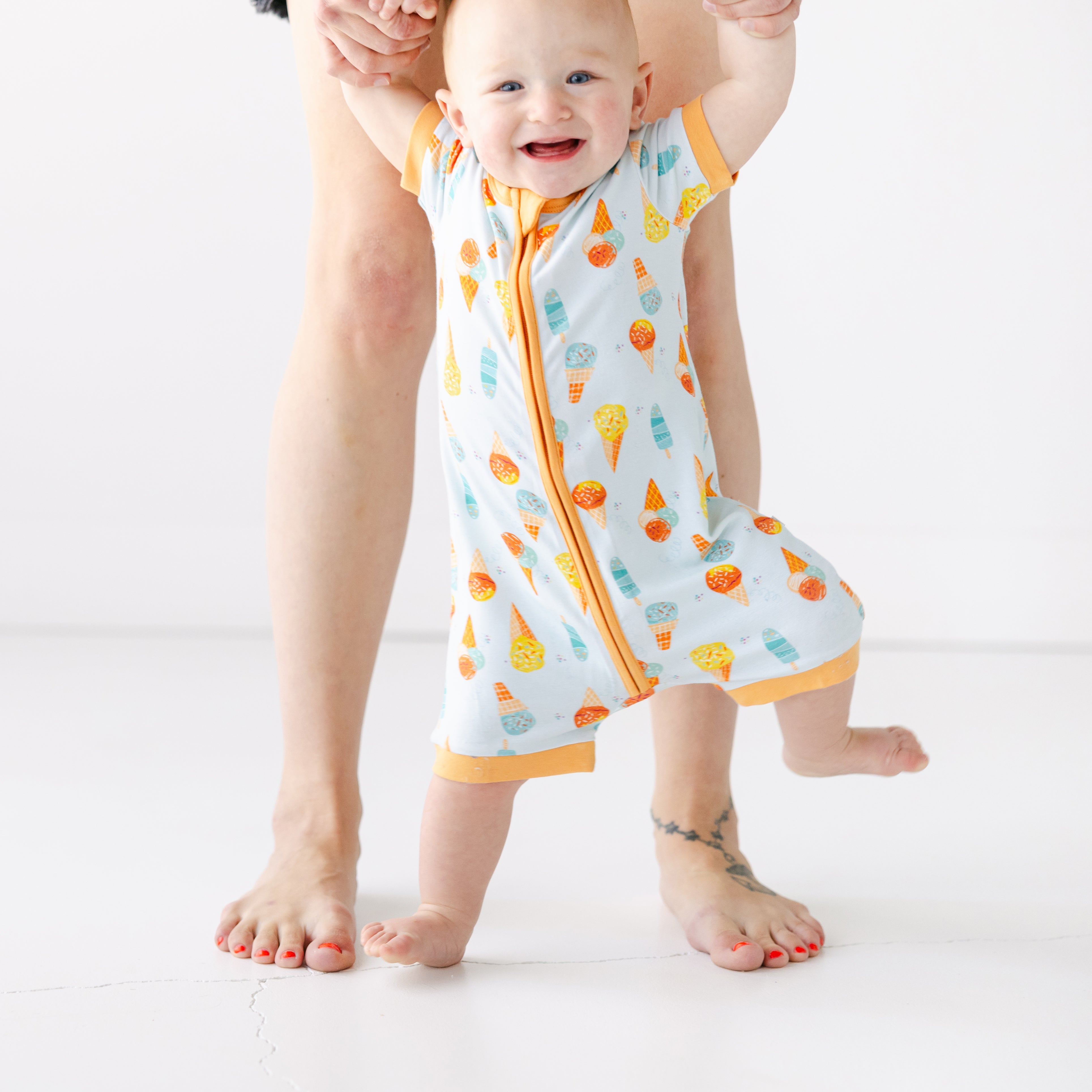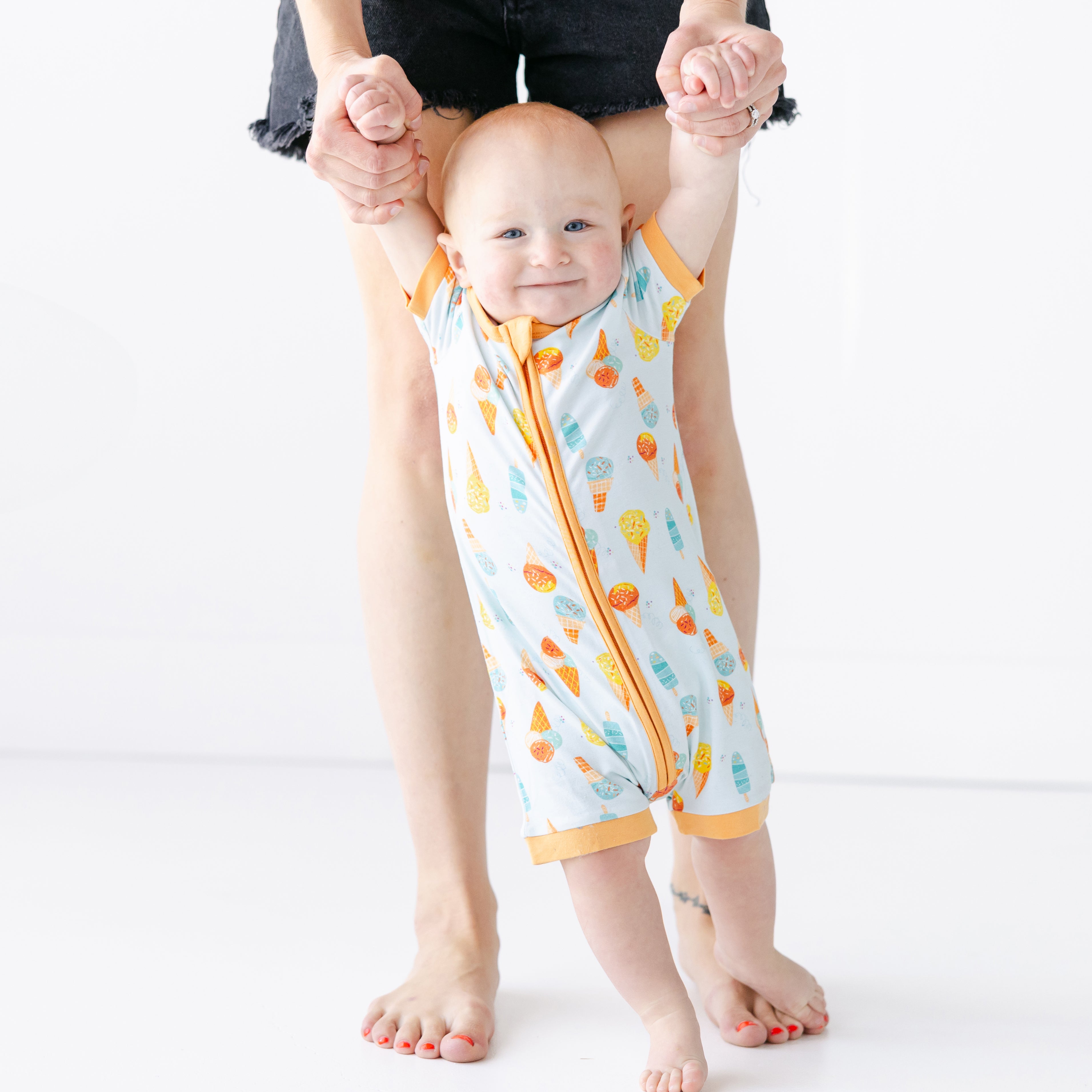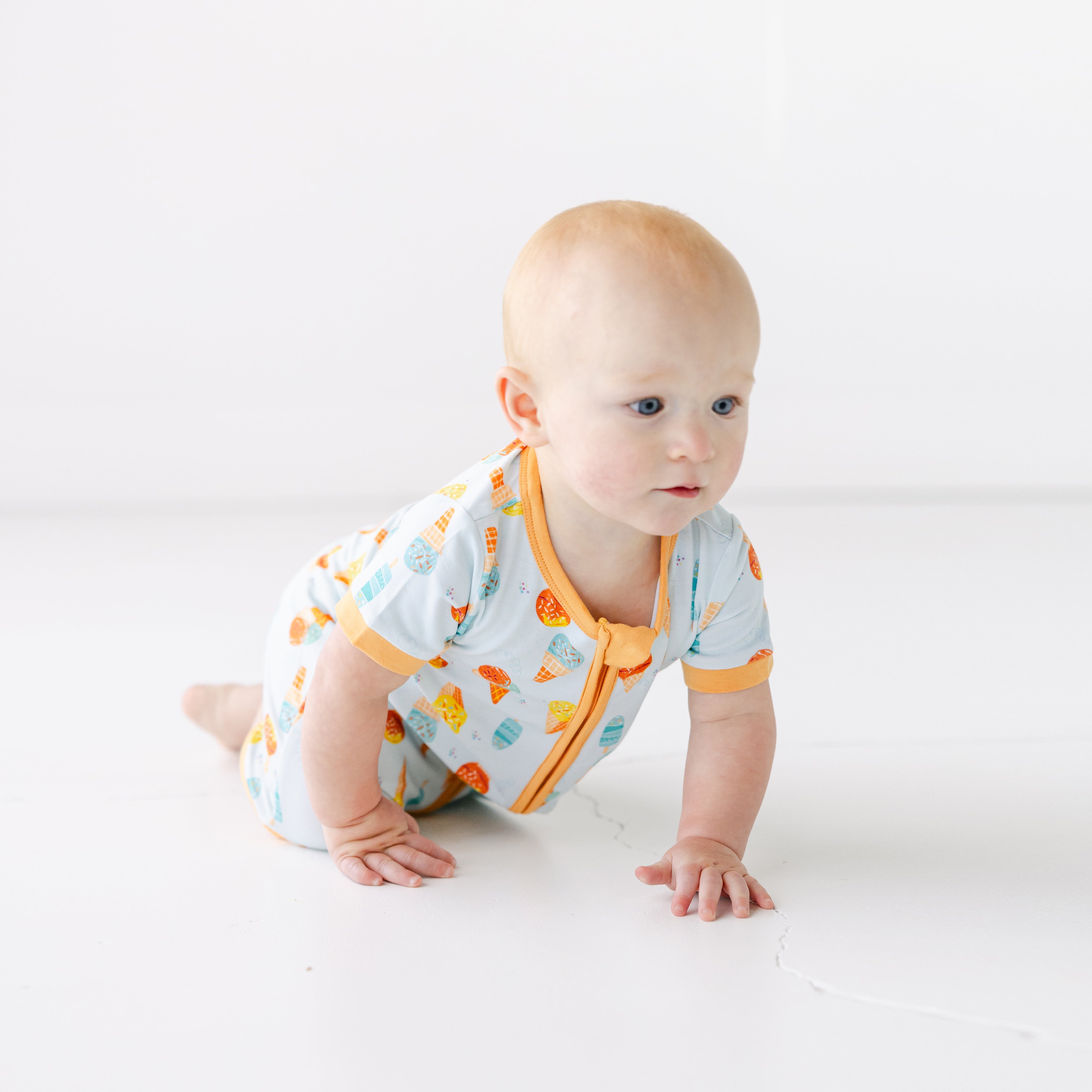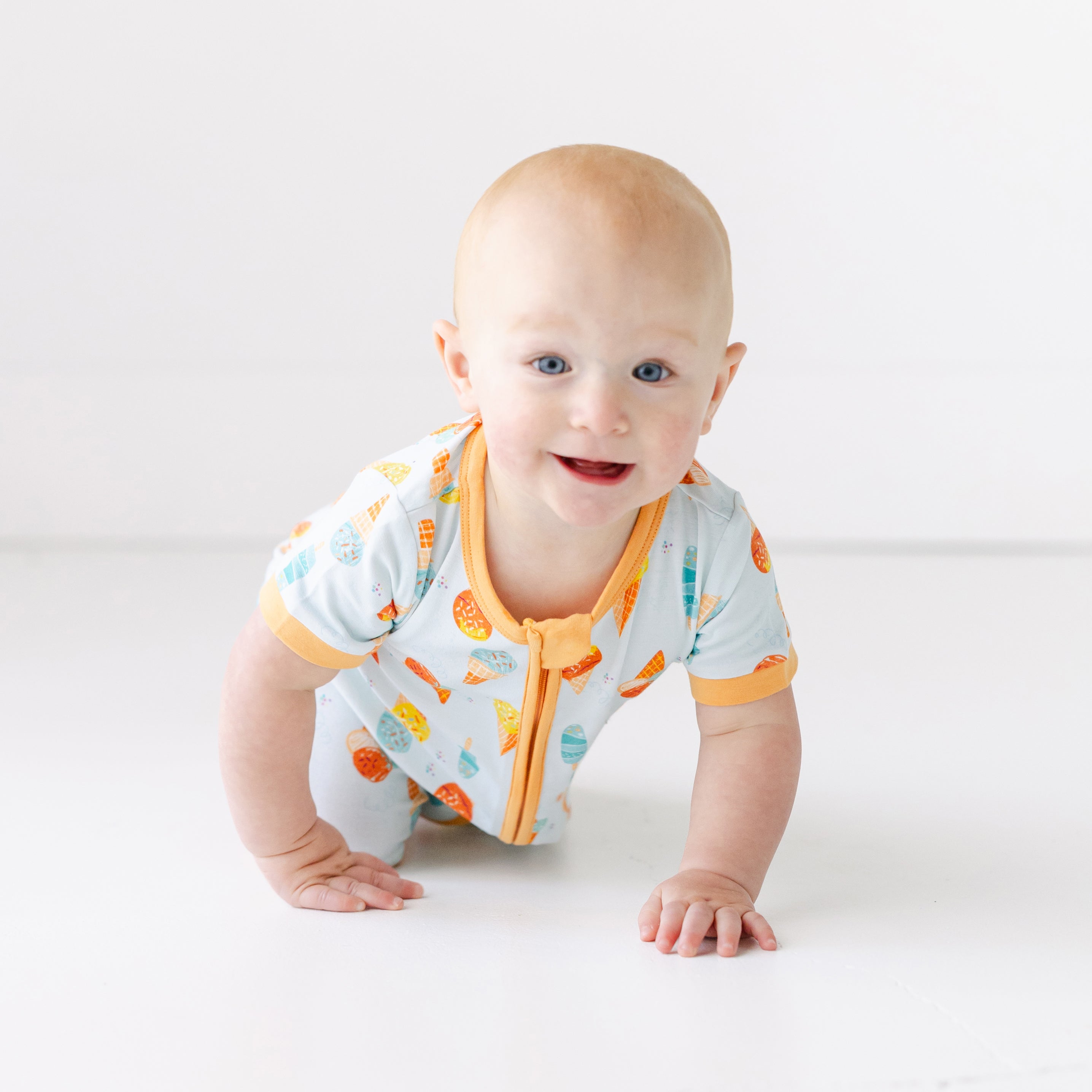 Sweeten your baby’s sleepwear with our I Scream For Ice Cream Short Zippy! Featuring a delightful ice cream print, these bamboo pajamas for summer are perfect for warm nights. Crafted from 95% bamboo viscose and 5% spandex, they offer a silky-soft touch and a comfortable fit. The short sleeves and shorts, paired with a handy zipper, make this bamboo short zippy set ideal for quick and easy dressing. Treat your baby to the ultimate in comfort and cuteness with these charming baby bamboo pajamas.